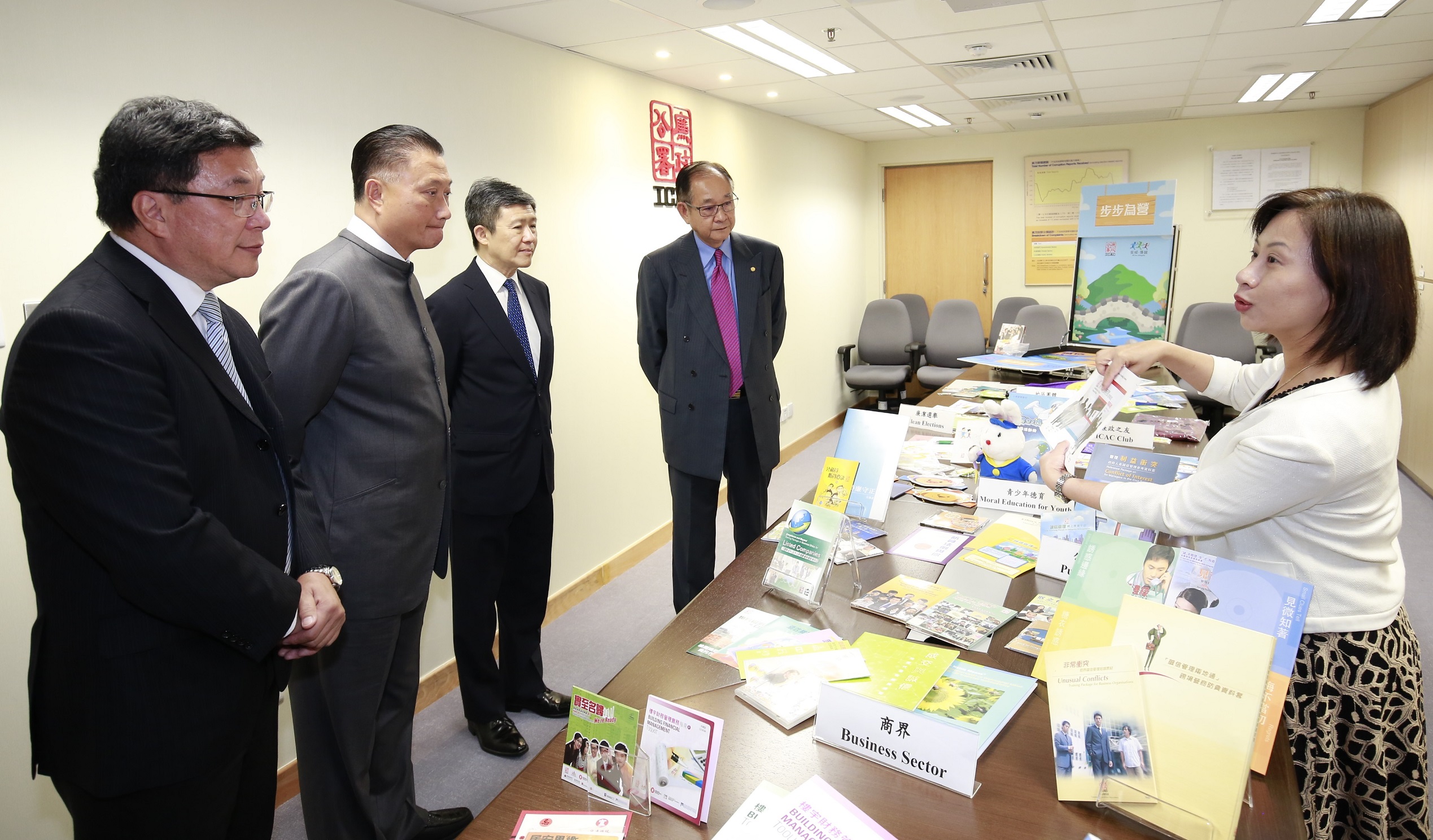 Officer of the Regional Office shares ICAC Commissioner Simon Peh (middle) and officiating guests ICAC’s publications on prevention and education.