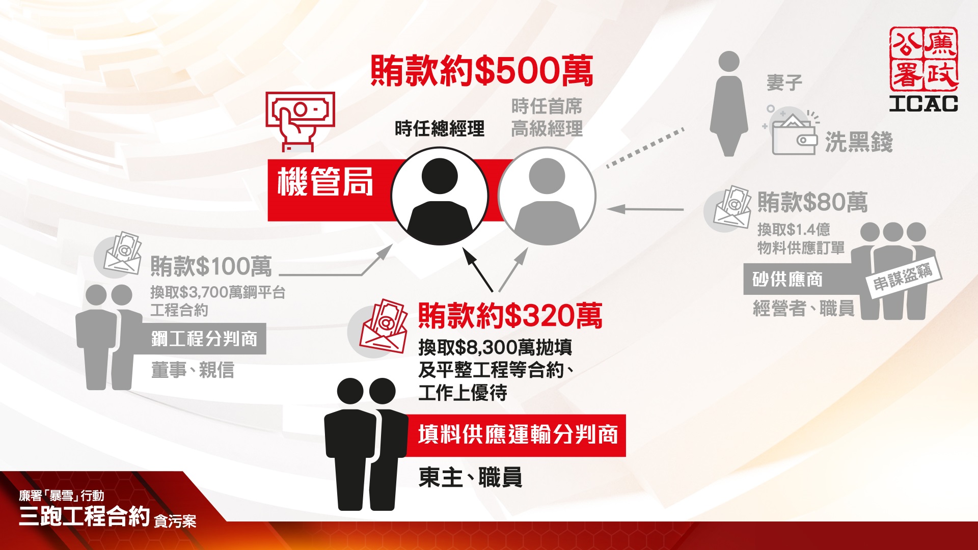 廉署去年8月中采取「暴雪」执法行动,拘捕多人就三跑项目涉嫌贪污,经深入调查后分五宗案件起诉10人。廉署获律政司进一步法律意见后,加控机管局前总经理殷国强(62岁)及三跑项目分判商卡乐工程有限公司(卡乐)东主吴启安(66岁)一项串谋使公职人员接受利益罪名。