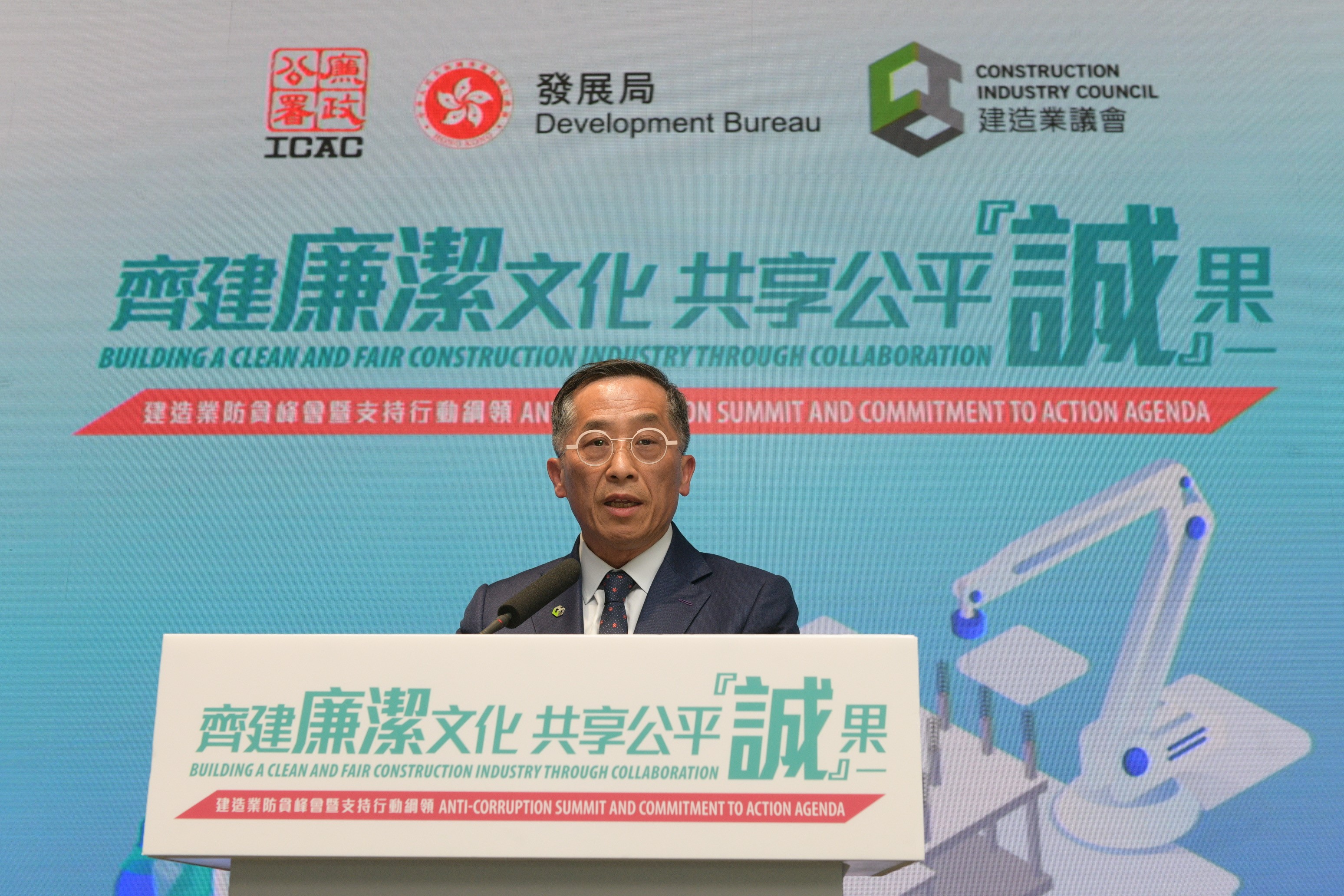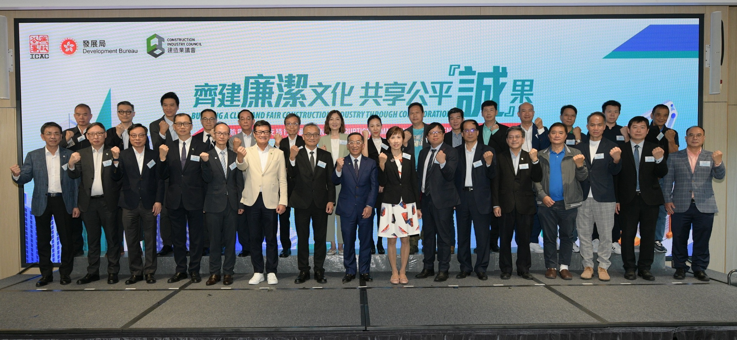 廉政公署今日(5月4日)联同发展局及建造业议会,合办「齐建廉洁文化 共享公平『诚』果 」建造业防贪峰会暨支持行动纲领活动,为建造业界推动防贪和诚信管理,建立廉洁文化。