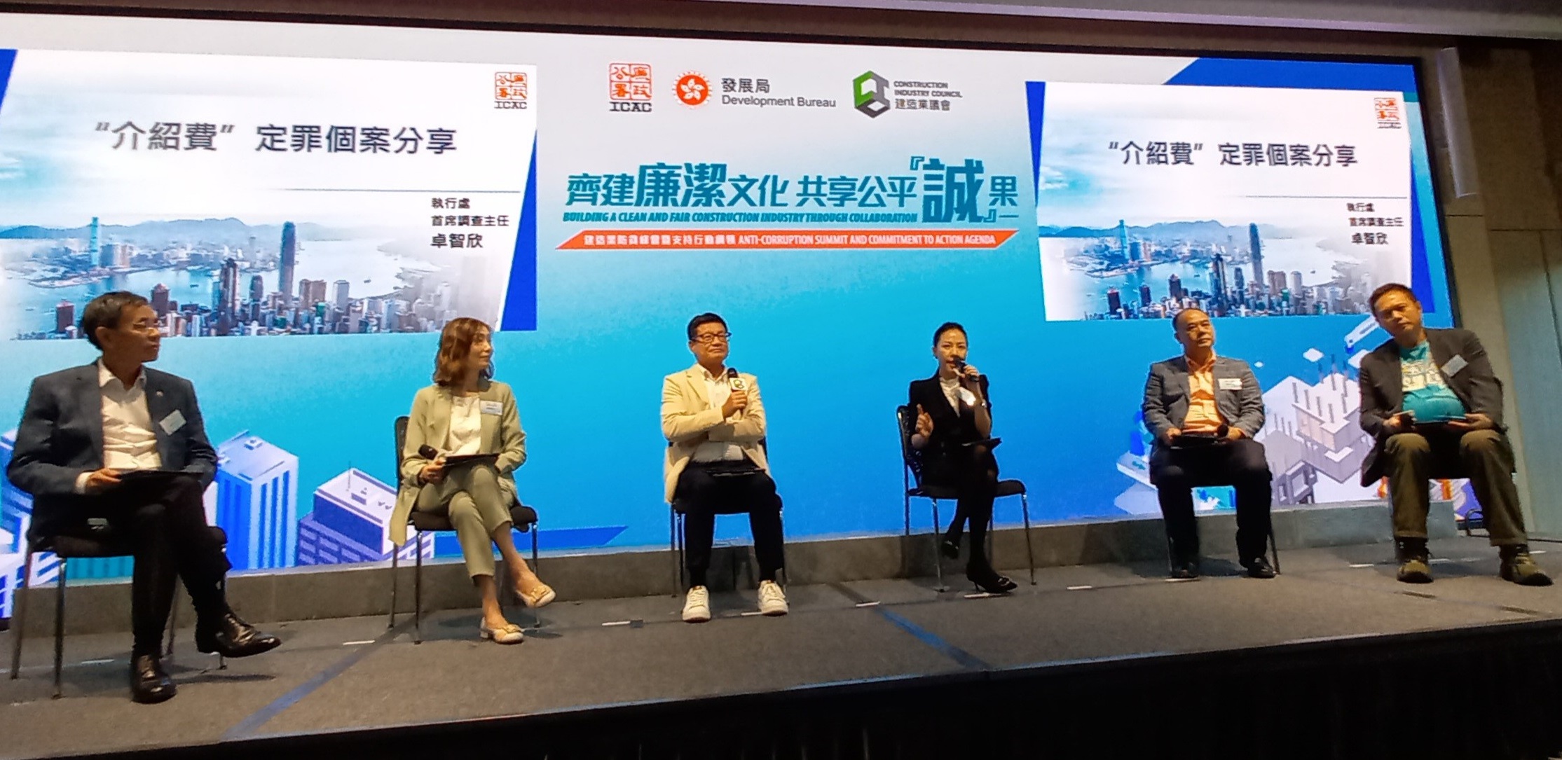 此外,执行处首席调查主任卓智欣及廉署香港商业道德发展中心总干事楼国媚,亦参与由建造业议会执行总监郑定寕工程师主持的另一讨论环节,向与会人士分享如何杜绝业界不法行为和建立廉洁文化,包括建议由公司直接聘用和管理员工以避免依赖中介、全力协助廉署调查工作和提升工人防贪意识等。廉署人员亦分享有关建造业介绍费的定罪个案,令与会人士更了解业内贪污风险和刑责,并介绍廉署就宣传及教育方面的资源及服务。