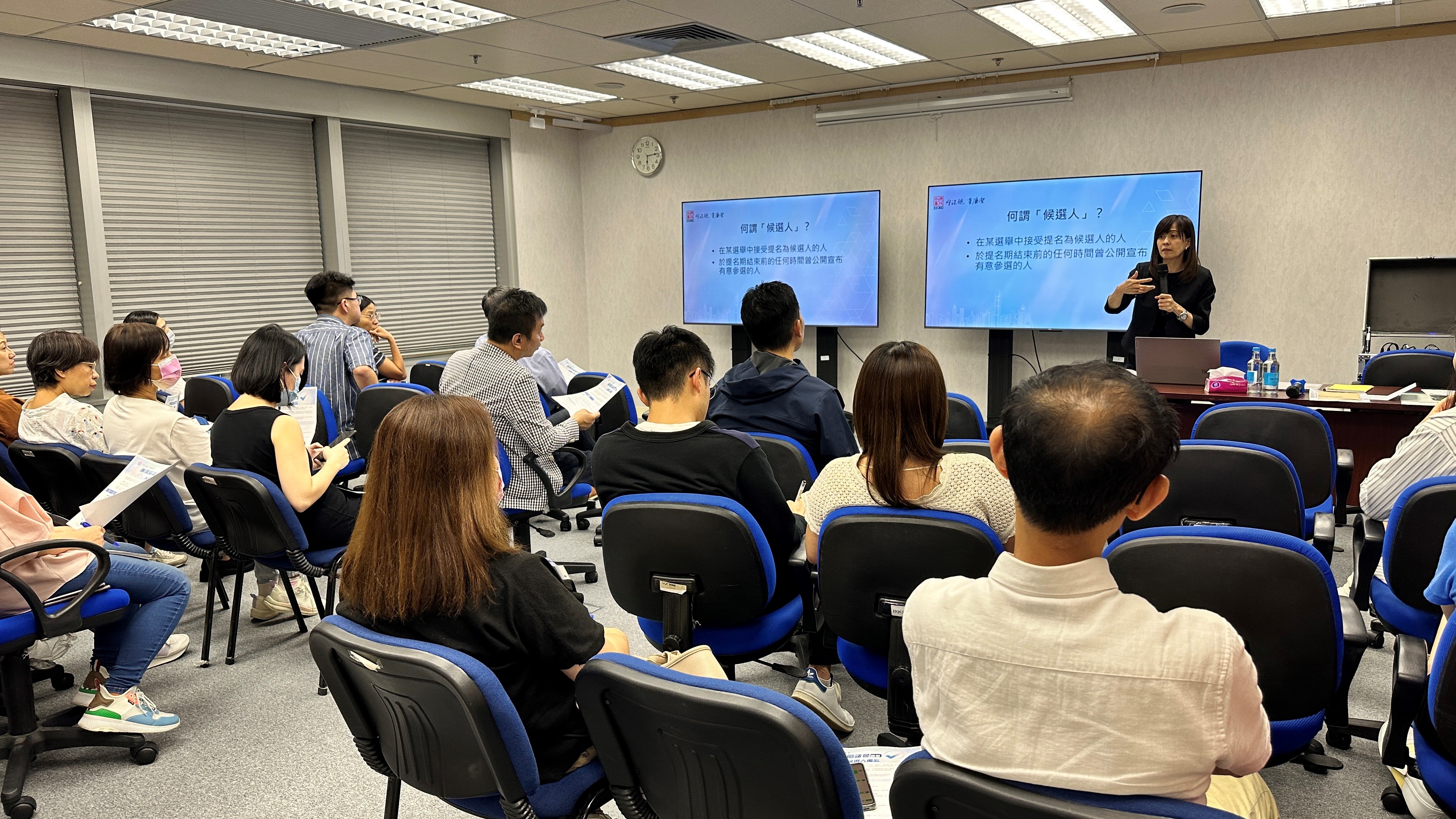 她又表示:「廉署在香港岛、九龙及新界区已举办三场简介会,供地区团体、楼宇管理组织及市民参加;并将为超过30,000名票站人员举办讲座,提高他们对投票和点票程序涉及的贪污风险及选举相关罪行的警觉。」