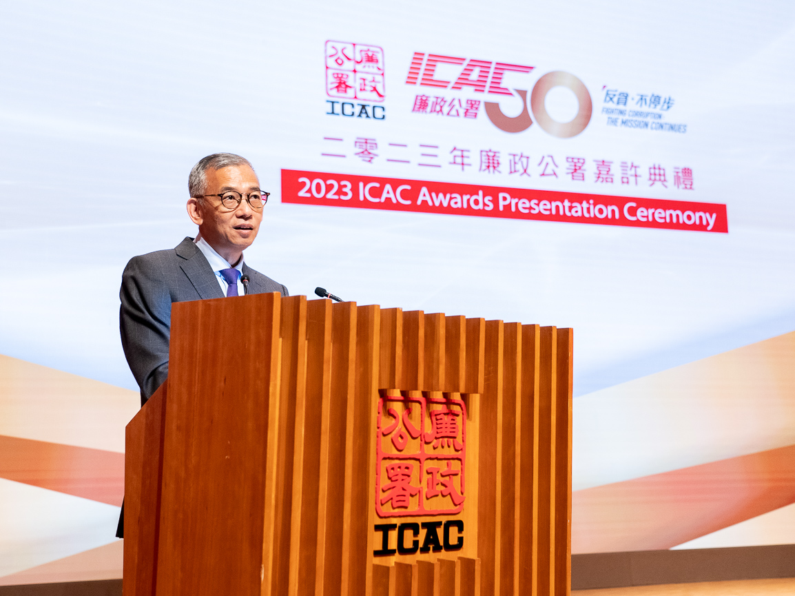 廉政专员胡英明在2023年廉政公署嘉许典礼致辞时感谢廉署人员长年累月,无畏无惧执行肃贪倡廉工作。过去一年在廉署人员的努力下,于执法、防贪、教育和国际合作等领域,都取得突破性发展。