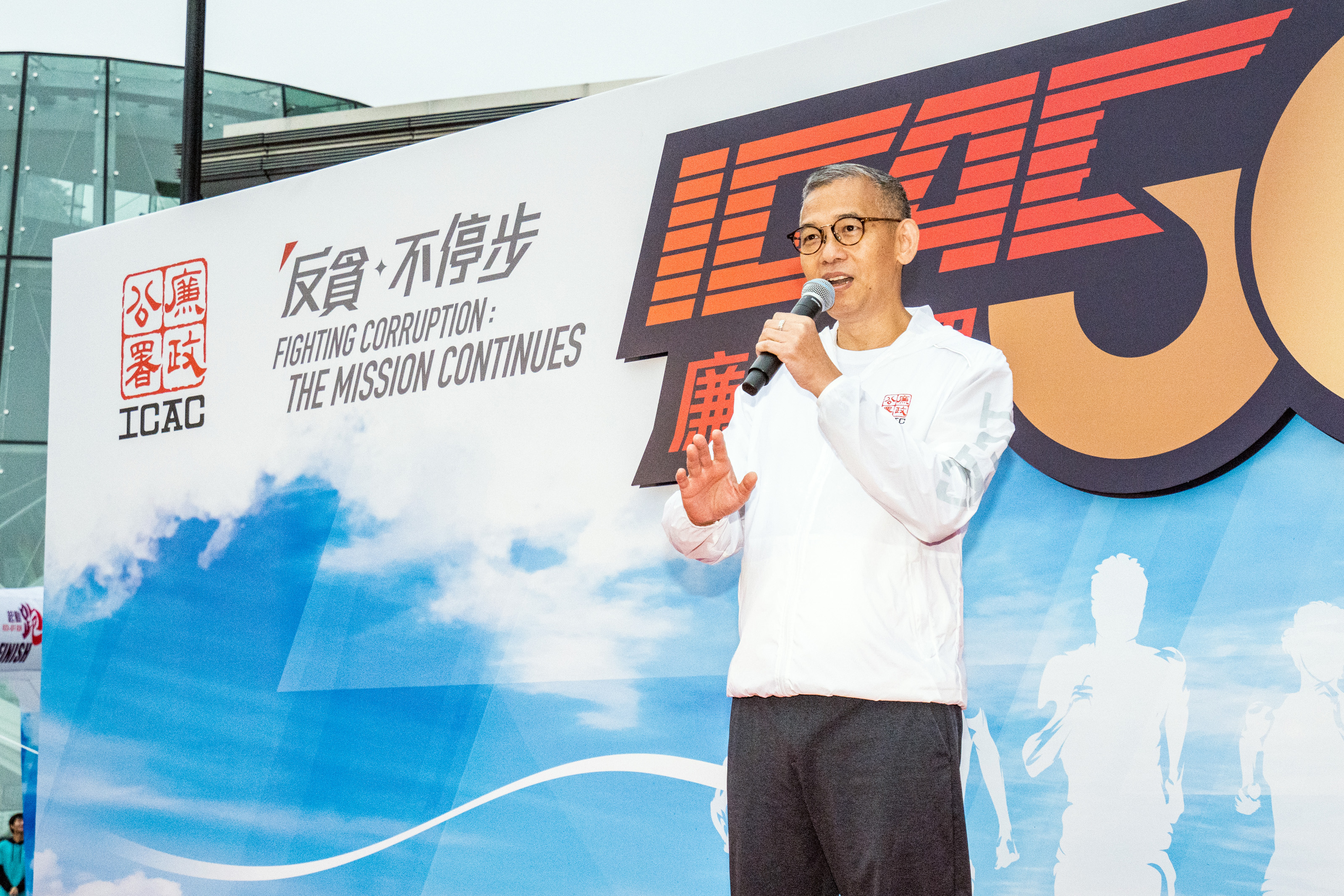 胡英明致辞时鼓励参加者竭尽所能,跑出最佳成绩,秉承廉署于过去半世纪坚持反贪的奋斗精神。他表示:「回顾过去半世纪,反贪路上面对重重难关,但在政府、全港市民、以及廉署共同努力下,反贪工作从未停步,最终成功打造『廉洁之都』的美誉,让市民能够享受社会发展成果,安居乐业。」