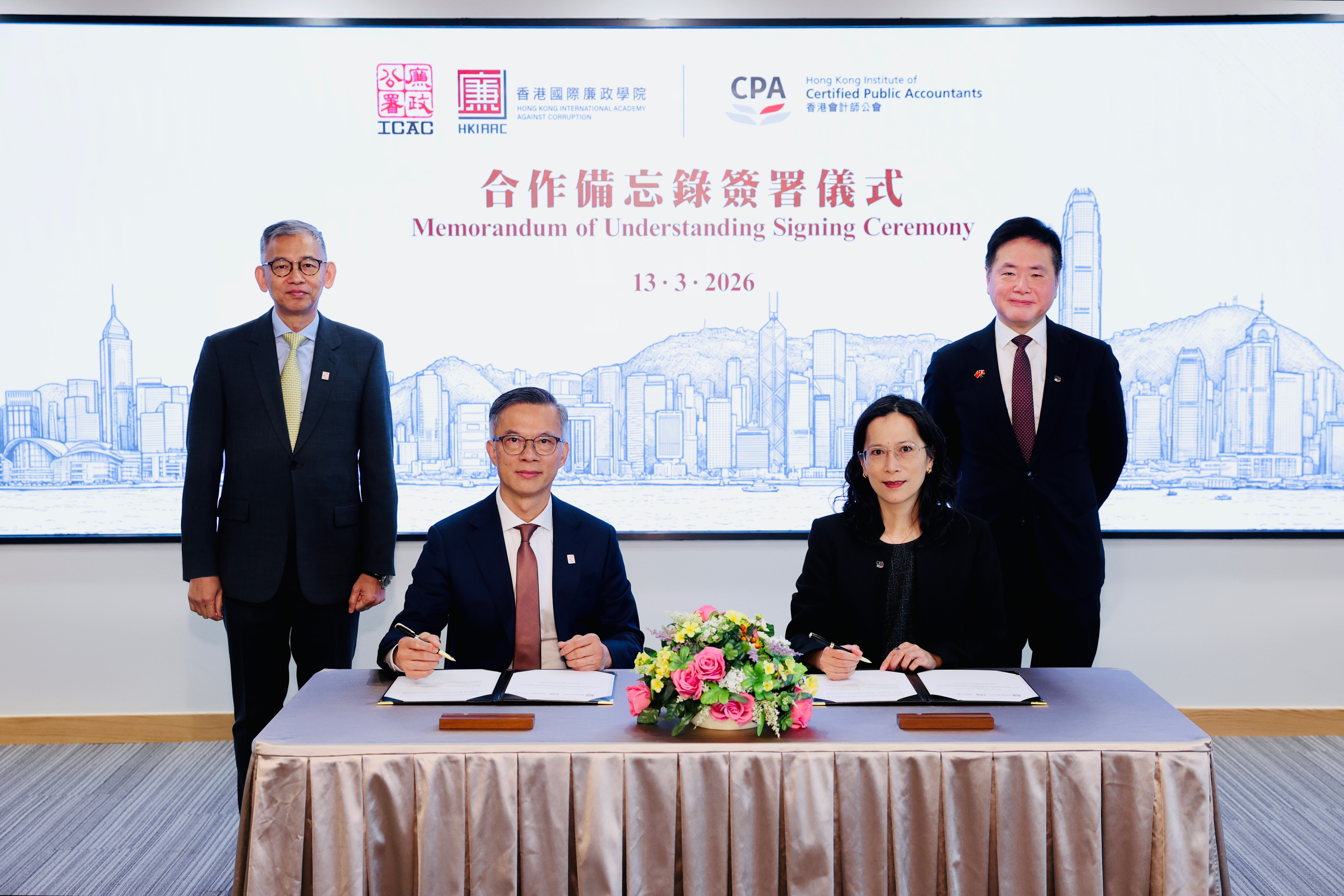 廉政公署辖下香港国际廉政学院(廉政学院)与香港会计师公会今日(3月13日)签订合作备忘录,标志廉署与香港会计师公会携手推动廉洁专业诚信,协力提升会计业界的道德标准、专业能力和廉洁意识。