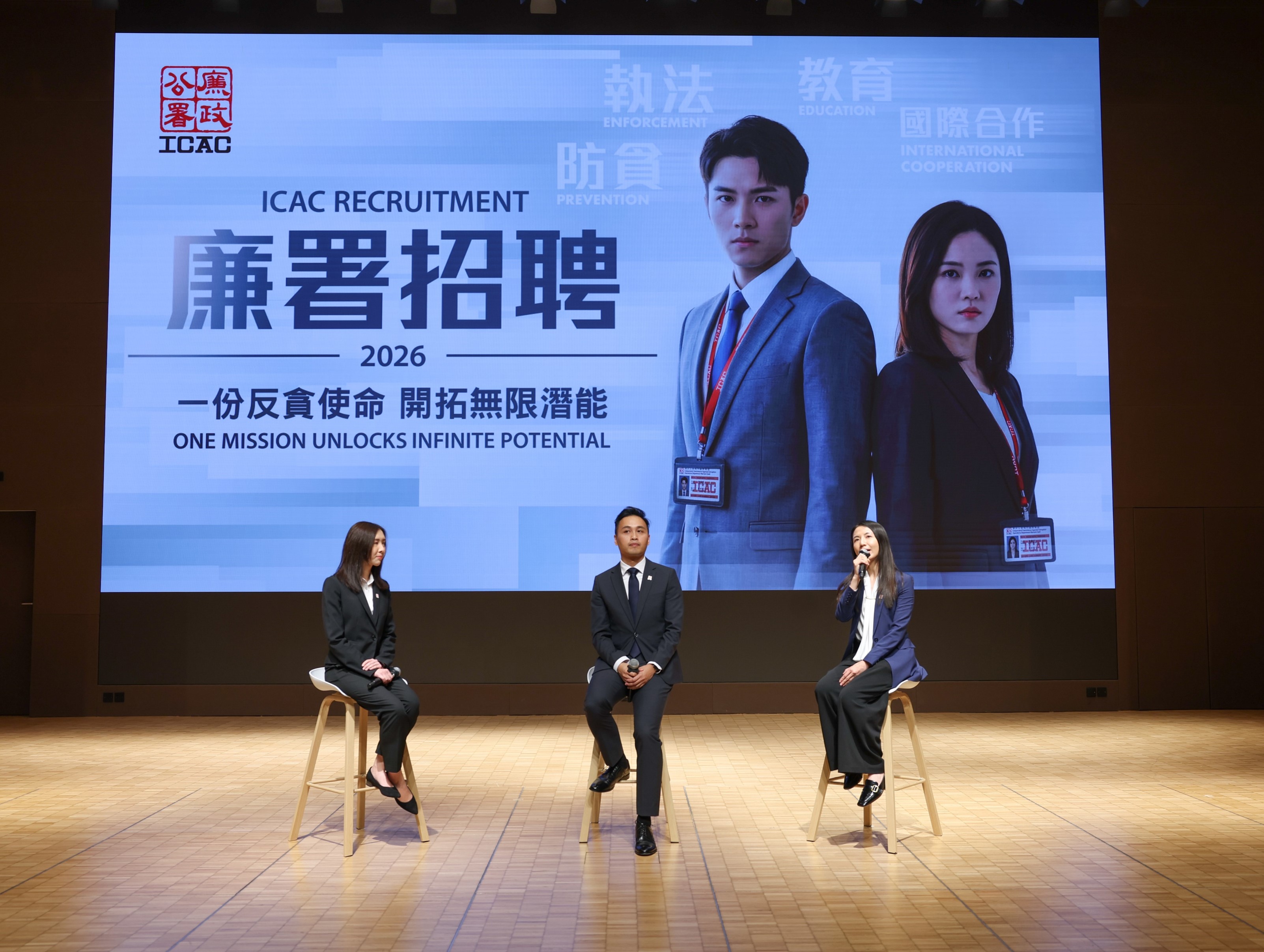 廉署現正以「一份反貪使命 開拓無限潛能」為主題進行新一輪招聘,透過「一體化招聘 全方位培訓」革新人才發展策略,為轄下部門統一招聘及培訓廉政主任及助理廉政主任以填補空缺,截止申請日期為3月23日。「廉署招聘2026」網頁: