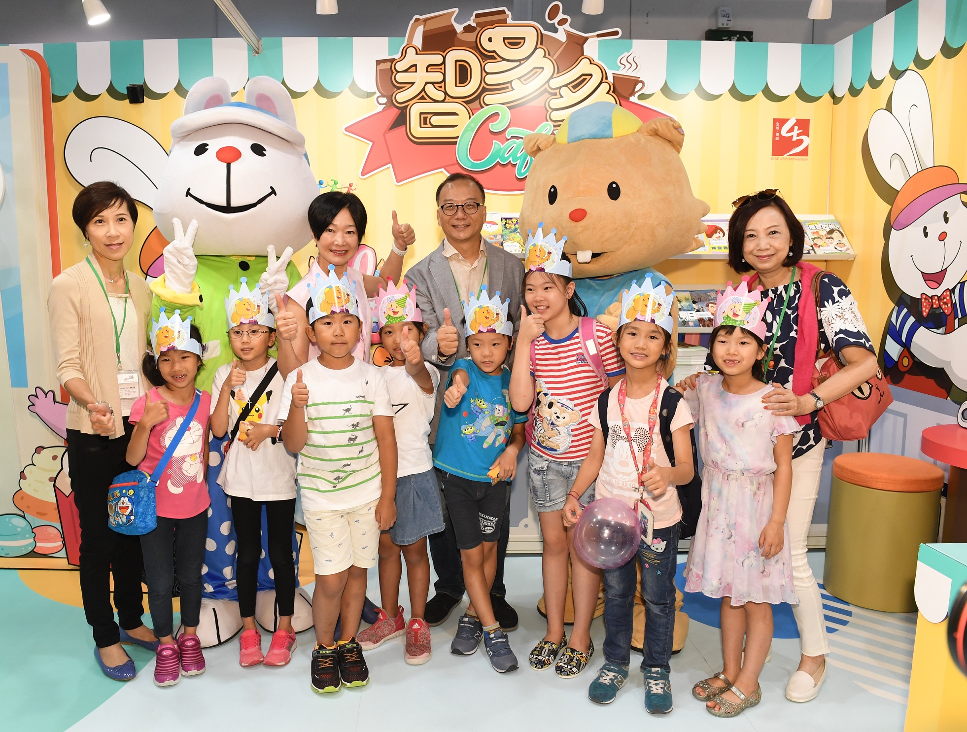 小朋友和家長們今日(七月二十日)一同參與廉政公署於香港書展舉行的卡通主題咖啡室開幕活動及講故事環節,標誌廉署為幼稚園及小學生傳揚正確價值觀而創作的經典卡通人物飛天兔「智多多」踏進二十周年。
